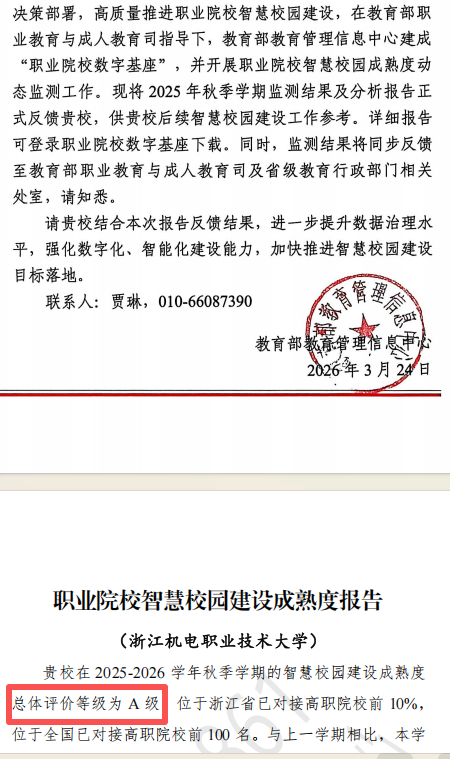 近日,教育部教育管理信息中心正式发布2025-2026 学年秋季学期职业院校智慧校园建设成熟度报告。我校在本次监测中再次荣获总体评价最高A级,位列浙江省已对接高职院校前10%、全国已对接高职院校前100名,这是我校连续第4次获得A级评价,充分彰显了我校在智慧校园建设方面的卓越成效。