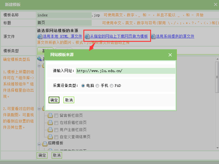 2、在新建模板页面窗口选择“从指定网站上下载网页做为模板”,输入要下载页面的网址