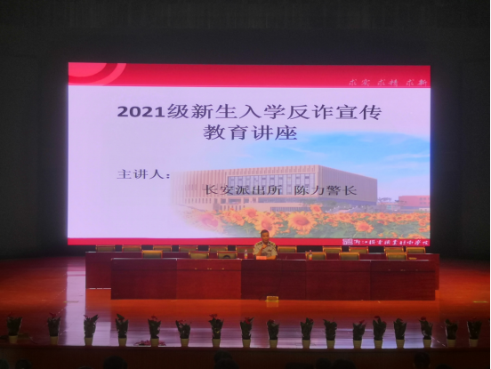 根据学校新生军训工作计划安排,为切实增强学生的安全防范意识和防诈骗意识,提高自我保护和防骗能力,使安全知识、安全技能入脑入心,保障学生的人身和财产安全,9月10日至19日,海宁校区综合办联合海宁市公安局、长安镇派出所为各学院新生举行新生安全及防诈骗教育专题讲座。讲座由海宁综合办主任陶勇主持,海宁综合办、学生处等相关职能部门安全负责人一同参加反诈宣传教育讲座学习。