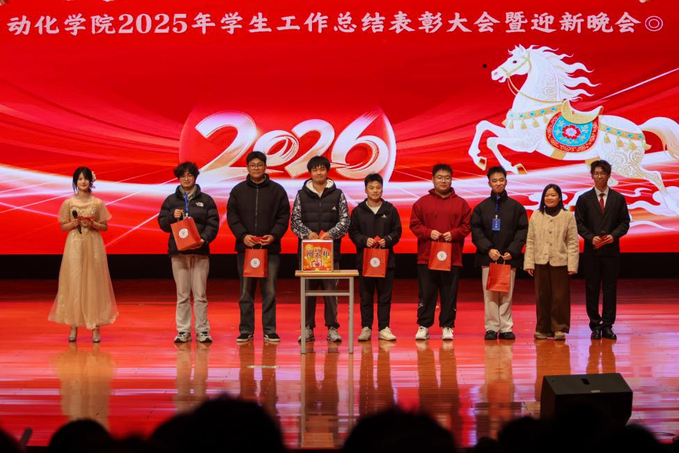 在热烈的文艺展演间隙,晚会还设置了惊喜抽奖互动环节。学院领导为幸运同学送上奖品和新年祝福。现场气氛瞬间升温,欢呼声与掌声此起彼伏,生动展现了自动化学院融洽和谐、亦师亦友的育人氛围。