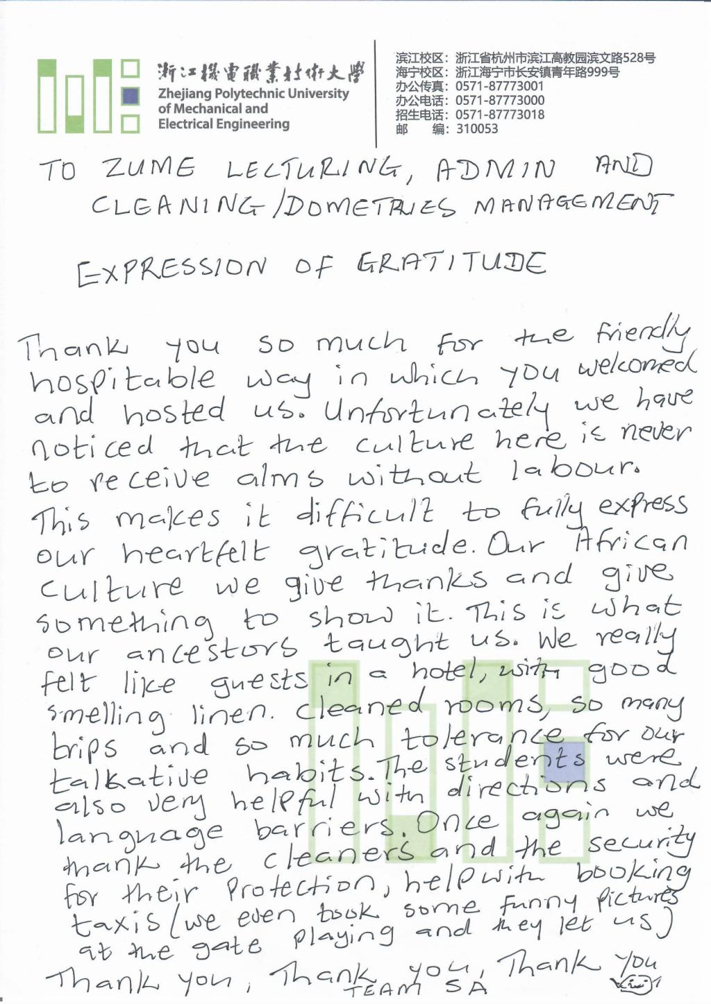 近日,一批来自南非职业院校的管理人员与骨干教师圆满完成在浙江机电职业技术大学海宁校区为期2周的学习培训任务。临行前,代表团成员亲笔书写感谢信,高度赞扬我校全方位、高质量的服务保障工作,并致以诚挚谢意。