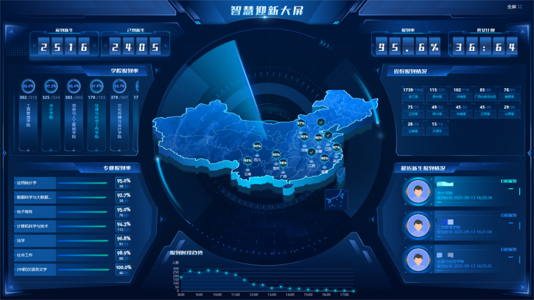 今年,东方学院首次使用线上“云报到”模式,全流程管控新生报到环节及数据统计。新生提前在“智慧迎新”系统中进行信息采集并开展“始业教育”。报到日当天,新生出示“报到码”,辅导员扫码即完成报到程序,后台可通过智慧大屏实时查看学生报到信息,整个流程周全、高效、贴心。