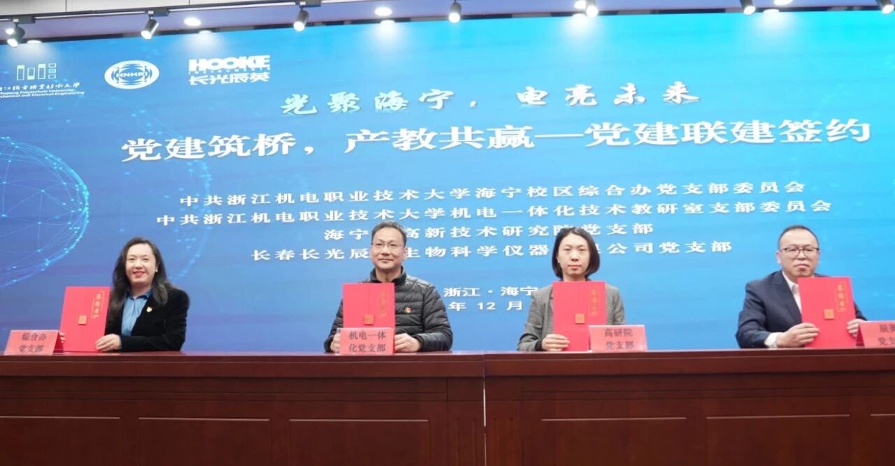 学院成立仪式上,浙江机电职业技术大学、海宁市高新技术研究院、海宁辰英科技有限公司、长春长光辰英生物科学仪器有限公司携手签约,海宁市、海宁高新区、长安镇等相关部门领导共同见证,共启“光电信息产业学院”新篇章。