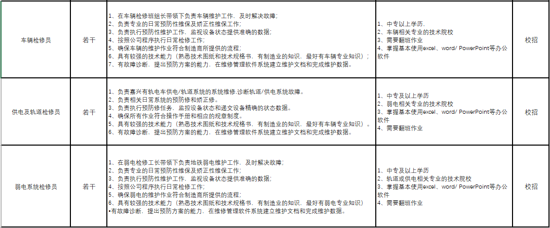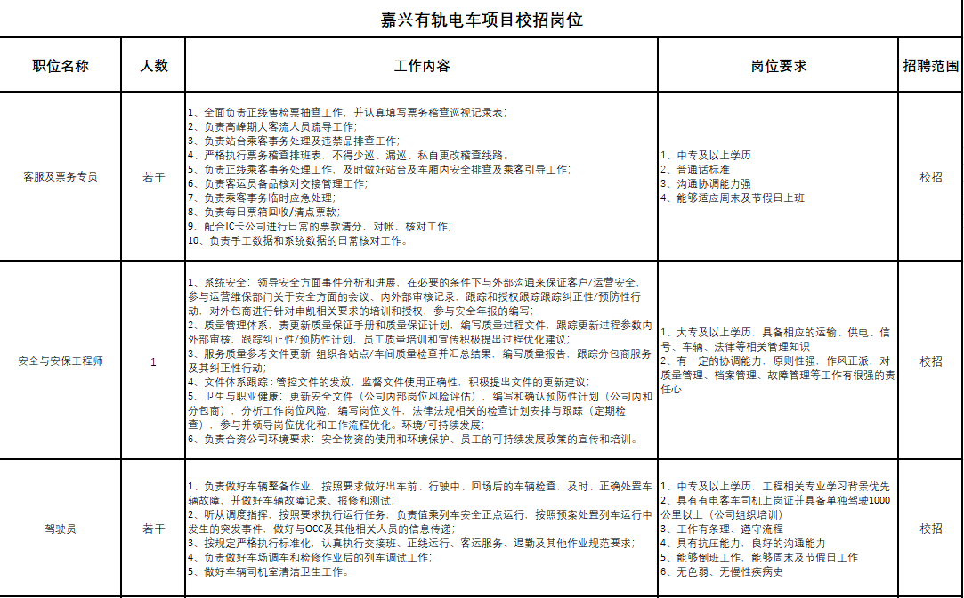 嘉兴有轨电车校招岗位