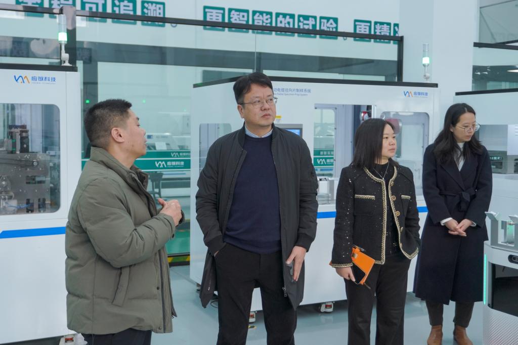 在俞敏波校友的陪同下,学院一行参观了公司办公环境、研发中心及实验场地。走访过程中,俞敏波详细介绍了企业自2016年创立以来的发展历程、核心技术与产品布局、主营业务开展情况以及所获得的一系列荣誉与资质。作为一家专注于电力智能检测与智慧实验室建设的国家级高新技术企业,应敏科技已逐步成长为年营收过亿、细分市场占有率领先的行业佼佼者,其自主研发的电力电缆系列试验设备、国内首台电缆直流电阻快速测量试验机等产品,有效解决了行业痛点,提升了检测效率与智能化水平。