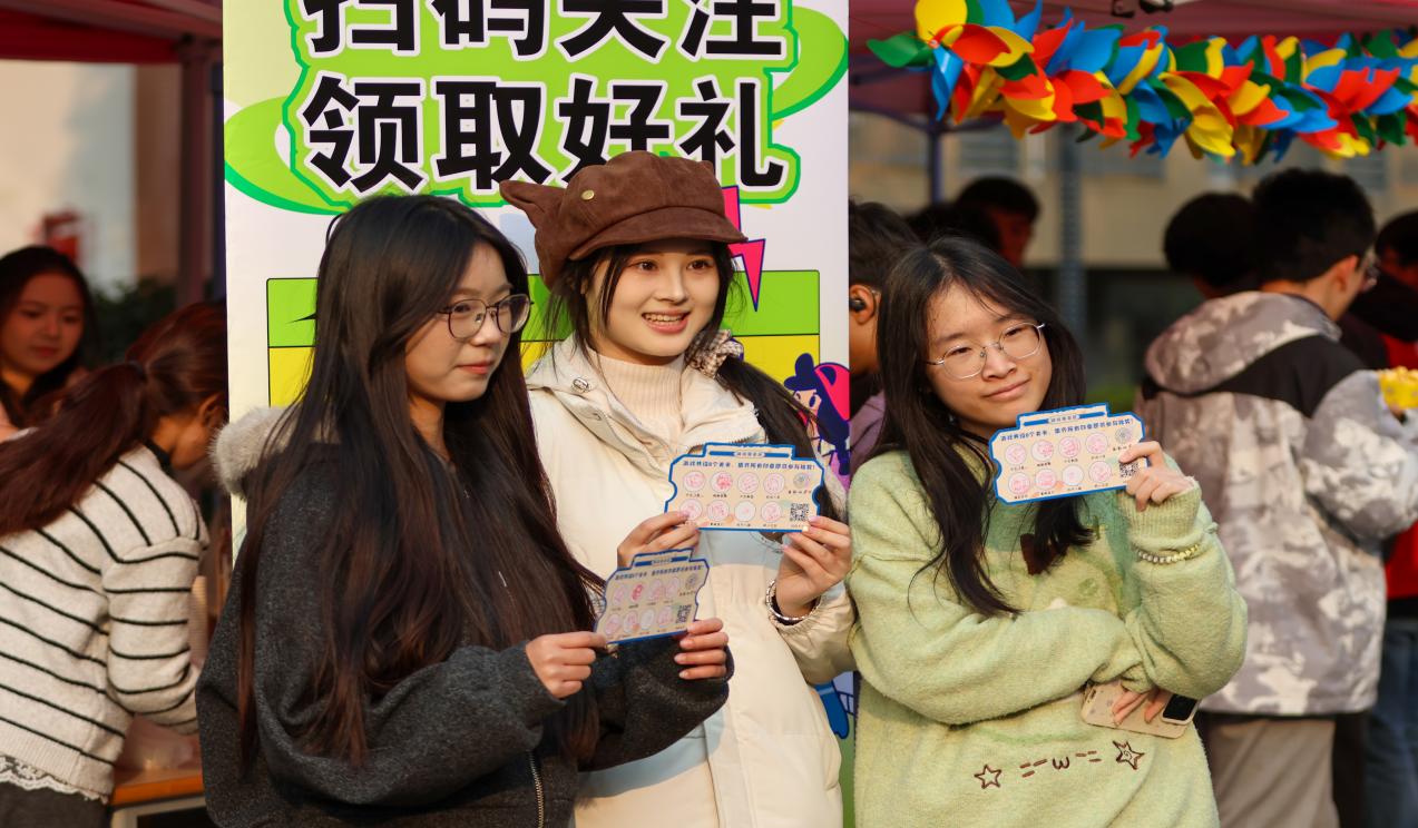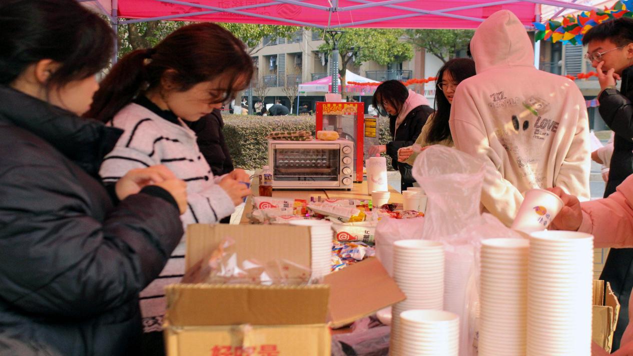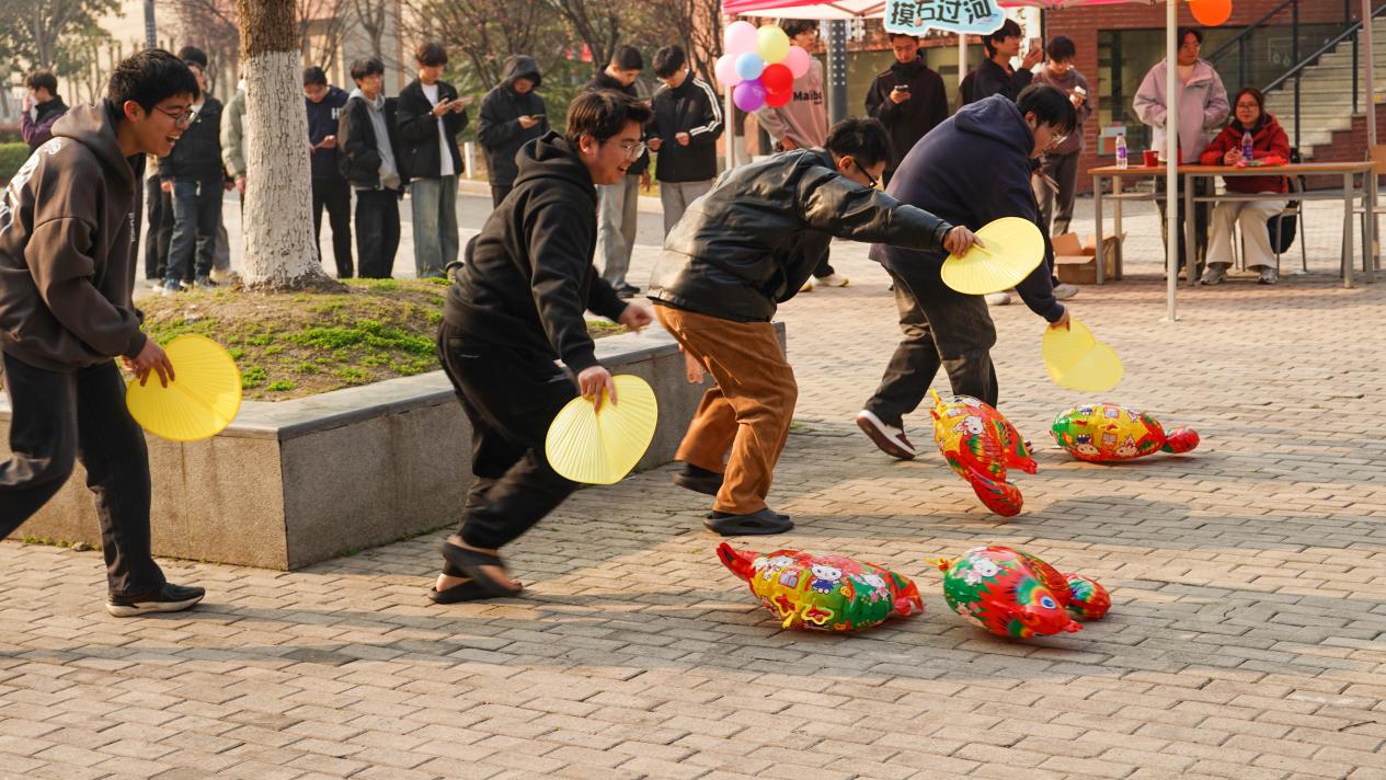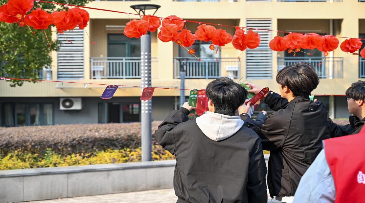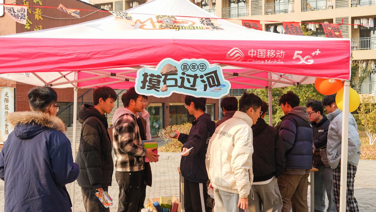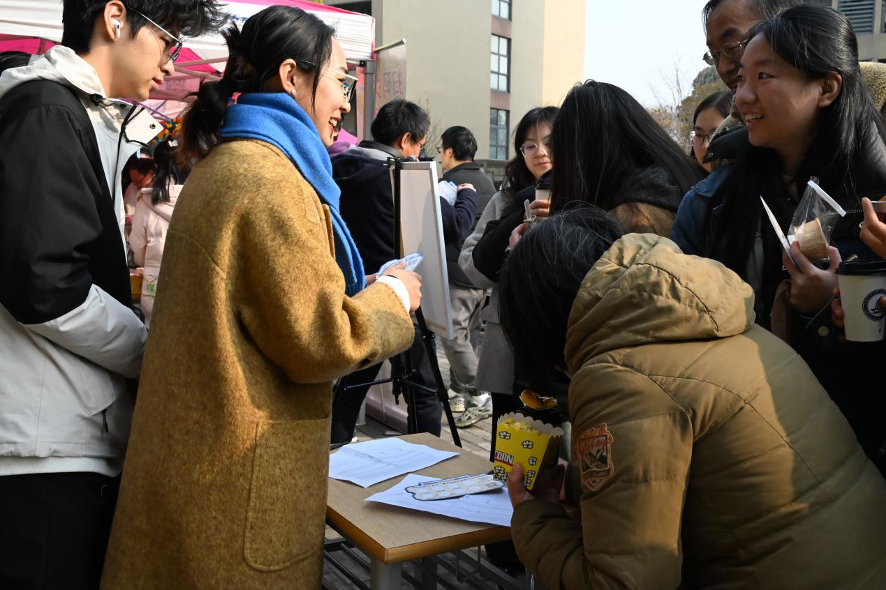 “猜灯谜”区域悬挂的彩色纸条随风轻扬,问答内容涵盖专业知识、文化常识等,雅趣盎然。同学们或驻足凝思,或相互讨论,猜中谜底时脸上洋溢的成就感,成为一道别致的风景。