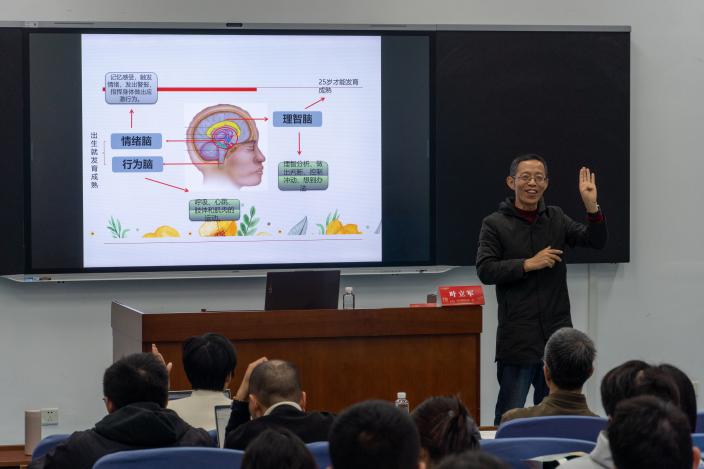活动伊始,叶立军老师以深厚的心理学理论积淀与丰富的咨询实践经验,引领在场教师步入了奇妙的“情绪解码”之旅。叶立军老师的讲解既专业严谨又风趣亲和。他从情绪的定义讲起,深入剖析了教师心理失衡特征以及教师心理问题的识别信号。老师们凝神聆听,时而会心微笑,时而认真记录,在叶老师的引导下,进行了一场深刻的自我觉察与内心探索。