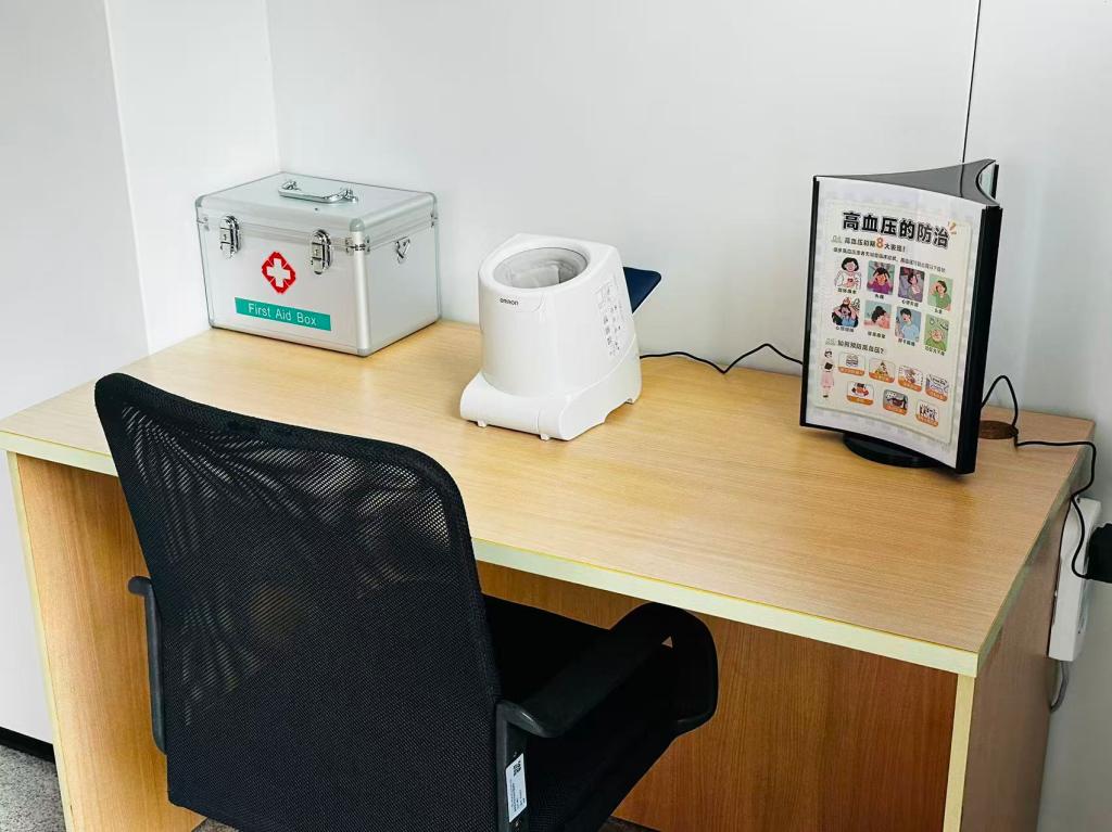 此次启用的“自助健康角”聚焦师生高频健康需求,实现“小问题就近办、小伤痛即时处”,面向全体师生免费开放。现场设有电子血压计,操作简便、一键即可完成血压、心率检测,方便大家随时监测健康指标,做好日常健康管理。同时,健康角配备标准化急救药箱,箱内备有创可贴、无菌纱布、绷带、碘伏棉签等常用外伤处置用品,可快速应对运动擦伤、轻微割伤等突发性小型外伤,满足课间、课后等场景下的紧急处理需求,有效填补校园即时健康服务的空白。无论是在繁忙的课间匆忙处理细微划伤,还是路过时顺手测一次血压,自助健康角以“触手可及”的便捷服务,把关怀落到细微之处、送到师生身边。