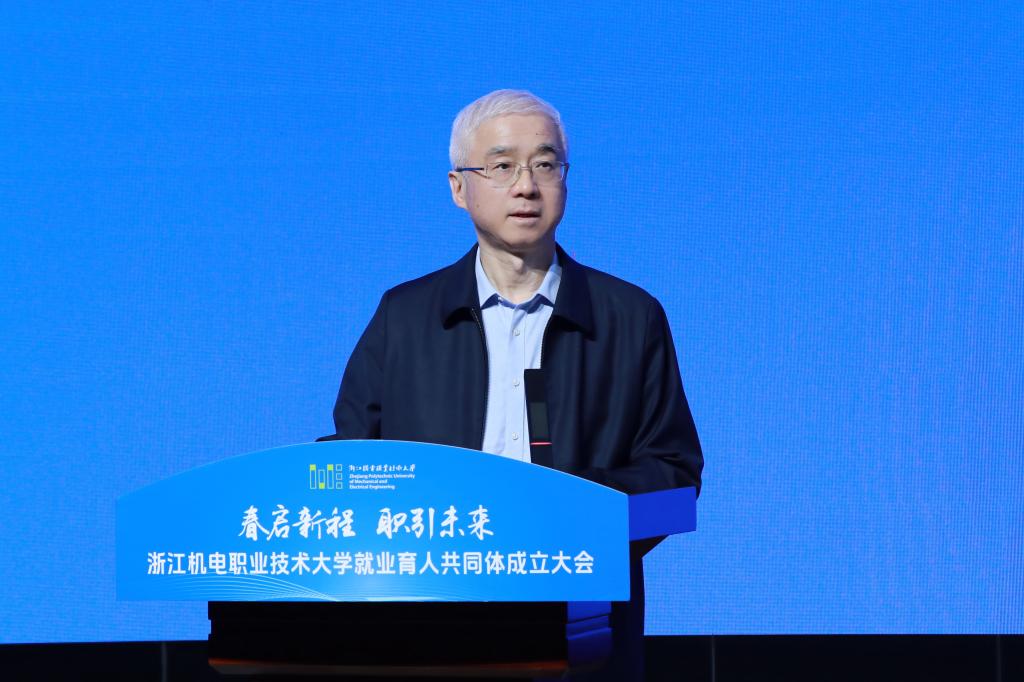 汪国辉对学校就业育人共同体成立表示祝贺。他指出,浙江机电职业技术大学牵头成立就业育人共同体是贯彻国省就业工作部署的具体实践,对于推动职业教育高质量发展、助力我省制造业强省建设、培育新质生产力具有重要意义。他强调,要坚守育人初心,锚定高质量就业根本方向,持续优化专业布局与人才培养模式;要深化协同联动,构建政校企三方共赢生态,把行业标准、企业标准、岗位标准融入教育教学全过程;要创新服务机制,打造就业育人示范标杆,充分发挥共同体的示范辐射作用。