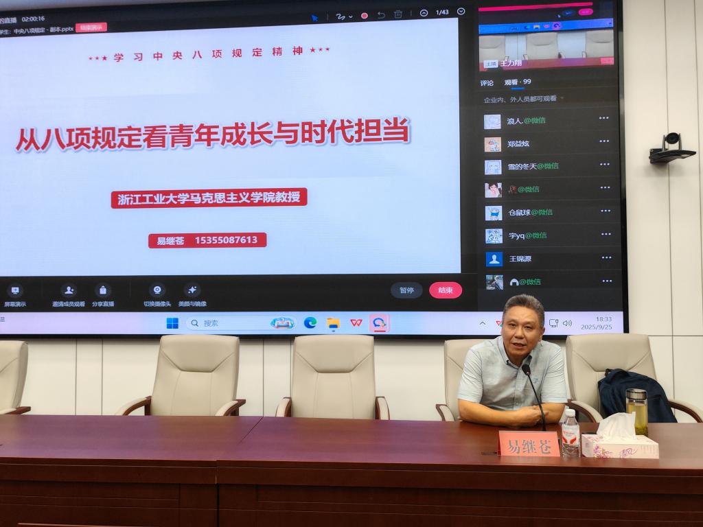 本次活动特邀浙江工业大学马克思主义学院易继苍教授主讲,讲座以《从八项规定看青年成长与时代担当》为题,为新生们带来一堂兼具理论深度与实践温度的廉洁教育课。讲座中,易教授以中央八项规定出台的时代背景为切入点,围绕“兴衰之基”“铁规解码”“践行之要”三大维度层层递进,系统阐释中央八项规定“改变中国”的深层逻辑,强调这一制度既是全面从严治党的重要抓手,更是青年锤炼品格、校准方向的价值坐标。