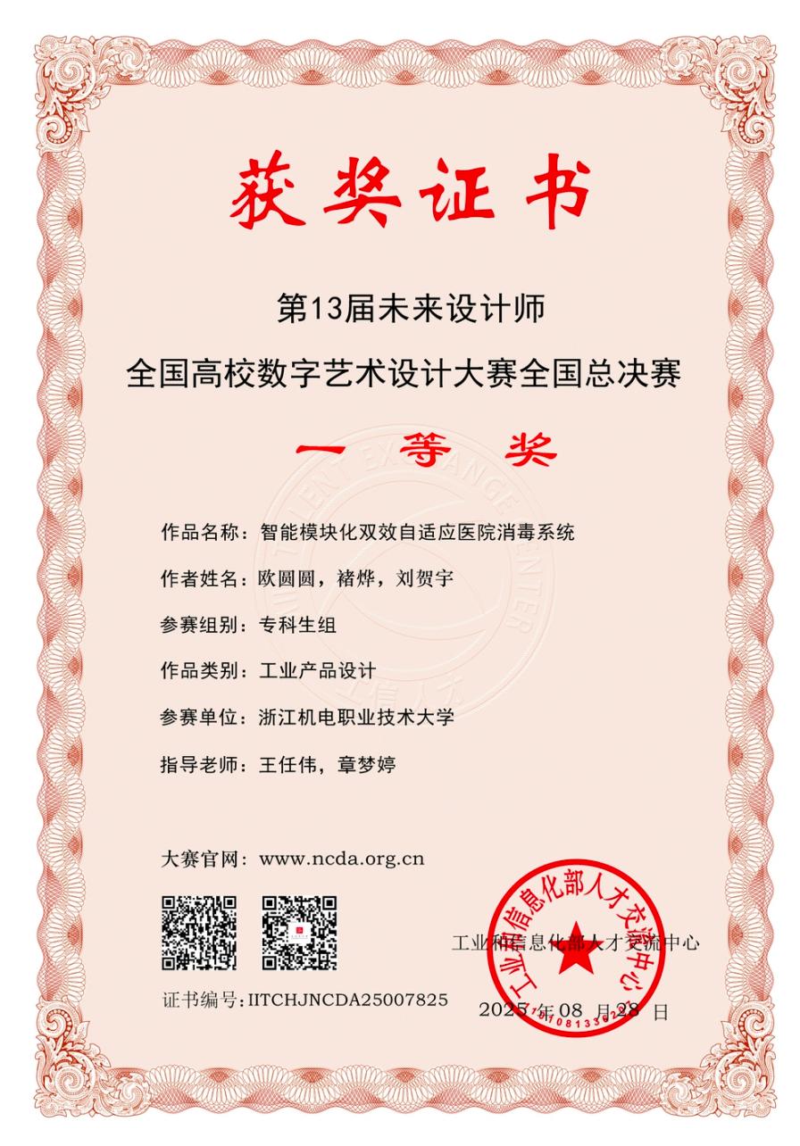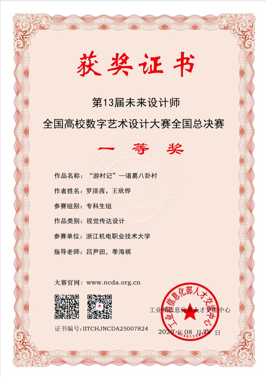 近日,2025年第十三届“未来设计师”全国高校数字艺术设计大赛(NCDA)省级与全国级获奖名单正式公示。经过校级选拔、资格赛、省级初赛、省级决赛到全国总决赛的多轮严格比拼,创意设计学院师生凭借扎实的专业功底与突出的创新设计能力崭露头角,在全国赛事舞台上交出亮眼答卷。其中,《“游村记”—诸葛八卦村》和《智能模块化双效自适应医院消毒系统》获得国赛一等奖,《古渊头村品牌文创设计》《冷链智运-智能协同冷链车》《凛冬雪域》《梦回河姆渡:河姆渡倒流香台设计》《青莲酷玩—寓教于乐互动小游戏》《诗竹江南》《逸动冰锋—分体式移动空调》7件作品获得省赛一等奖,另外其余作品获得省赛二等奖14项、三等奖4项。