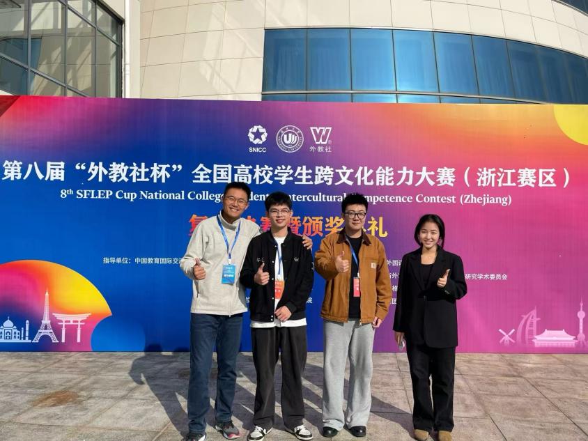 11月21日-23日,第八届“外教社杯”全国高校学生跨文化能力大赛在温州举行。经过激烈角逐,我校代表队在本科赛道中表现突出,荣获浙江省三等奖。