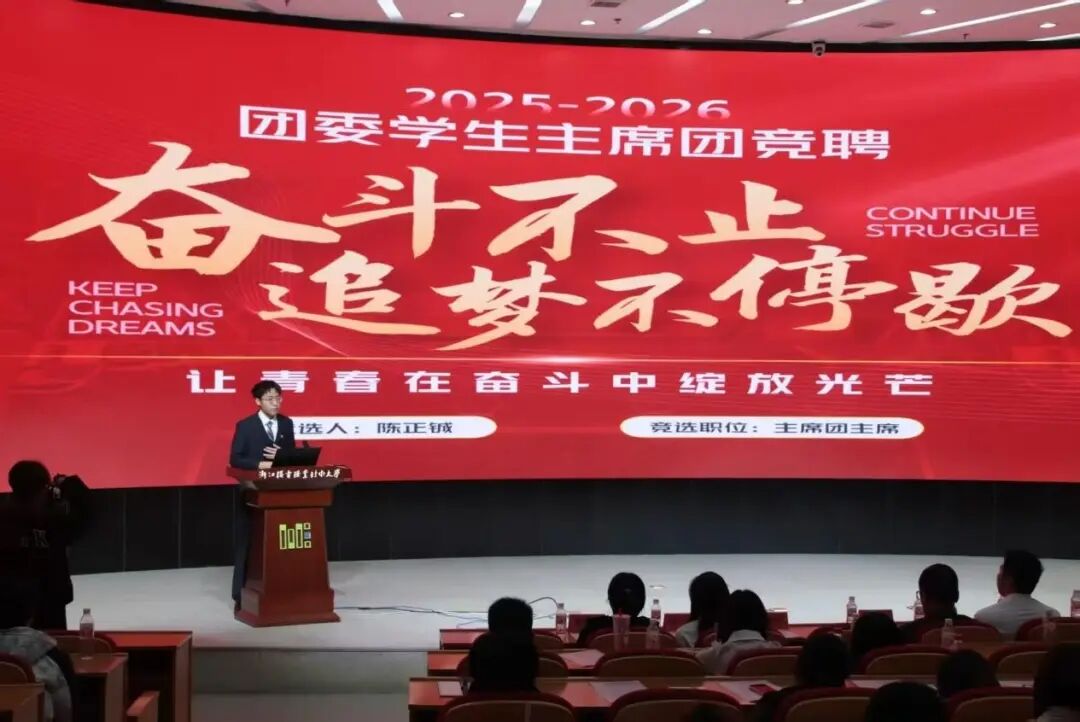 第十八届团总支副书记彭金标进行工作报告,从筑牢思想根基、夯实组织基础、打造专业特色三个维度,回顾了过去一年在理论学习、组织建设、赛事获奖、校园文化活动等方面的丰硕成果。