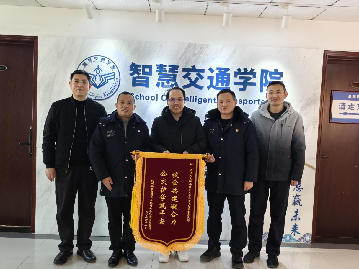 1月21日,一面书写着“校企共建凝合力 公交护学筑平安”的锦旗由杭州公交集团第二汽车分公司第六车队党支部赠予我校智慧交通学院,对一年来我院给予党建共建活动和学生志愿活动大力支持的表达感谢,成为双方2025年党建共建历程的重要见证。