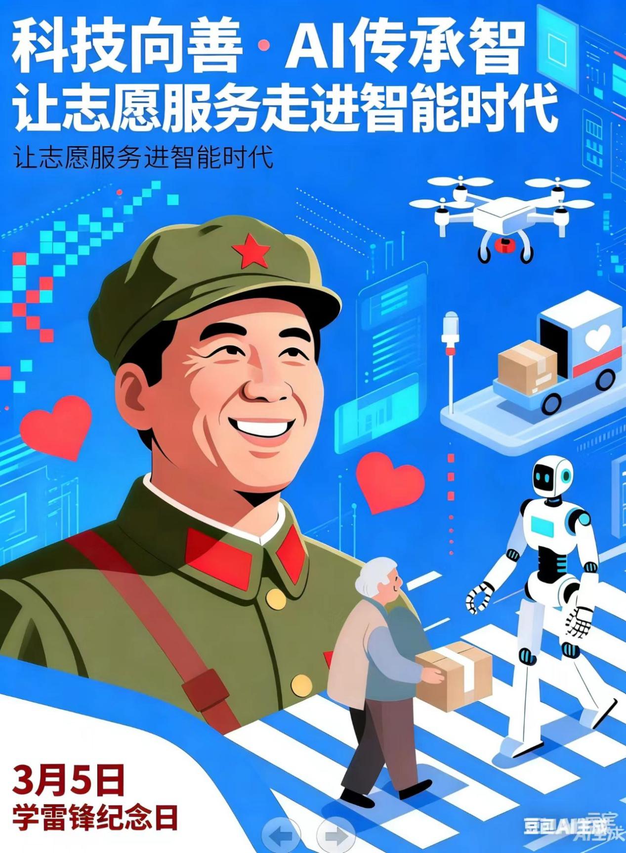三月中旬,我院结合“奉献、友爱、互助、进步”的志愿精神与人工智能学院的专业,举办AI海报活动。用AI描绘雷锋形象、AI技术赋能志愿服务、科技向善与雷锋精神、我眼中的新时代雷锋等。本次比赛鼓励学生运用AI技术手段,创作具有时代气息的雷锋主题海报,让传统精神在数字时代焕发新的光彩。