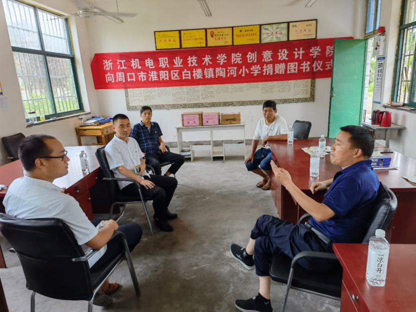 2021年7月22日上午9时,创意设计学院党总支心系河南洪水灾情,派员赴河南省周口市淮阳区白楼镇陶河小学开展灾情慰问与图书捐赠活动。共青团淮阳区委副书记段远鹏、白楼镇中心校党支部副书记、副校长曾祥军、白楼镇中心校党支部宣传委员、陶河小学校长刘炜、陶河小学副校长王义强、陶河行政村主任常勇以及我校创意设计学院党总支委员刘博盛出席了慰问捐赠活动。