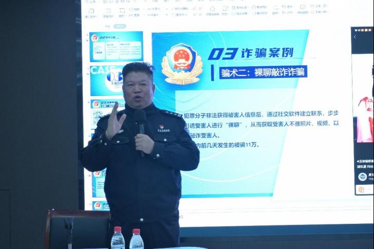 王警官结合当代大学生特征和智能制造学院实际情况,向同学们介绍剖析“裸聊骗局”,指出网络上很多所谓的美女帅哥其实都是假扮的,在P图和化妆技术的加持下足以做到以假乱真;同时,王警官介绍了刷单、AI等新式骗局,提醒同学们网络交友需谨慎。其次,王警官为同学们介绍季节性事故预防,从火灾事故、交通事故、酗酒滋事、网络安全、性侵事件、意外事件六个方面详细介绍防范措施和处理方法。最后,王警官寄语智造学子,提高安全意识,保护自我安全,努力学习本领,做新时代新青年。