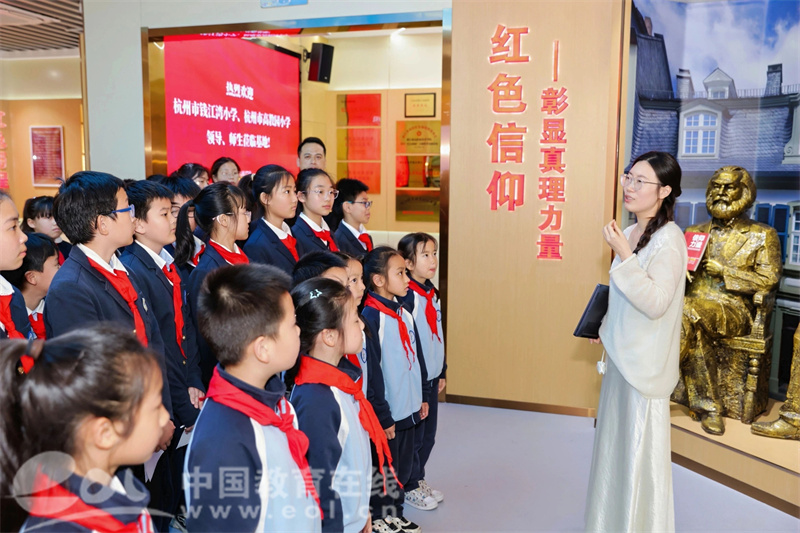 在筑牢"红色根脉"主题教育实践基地,机电大学王平平老师与钱江湾小学芮甜甜老师开展"双师同堂"教学: