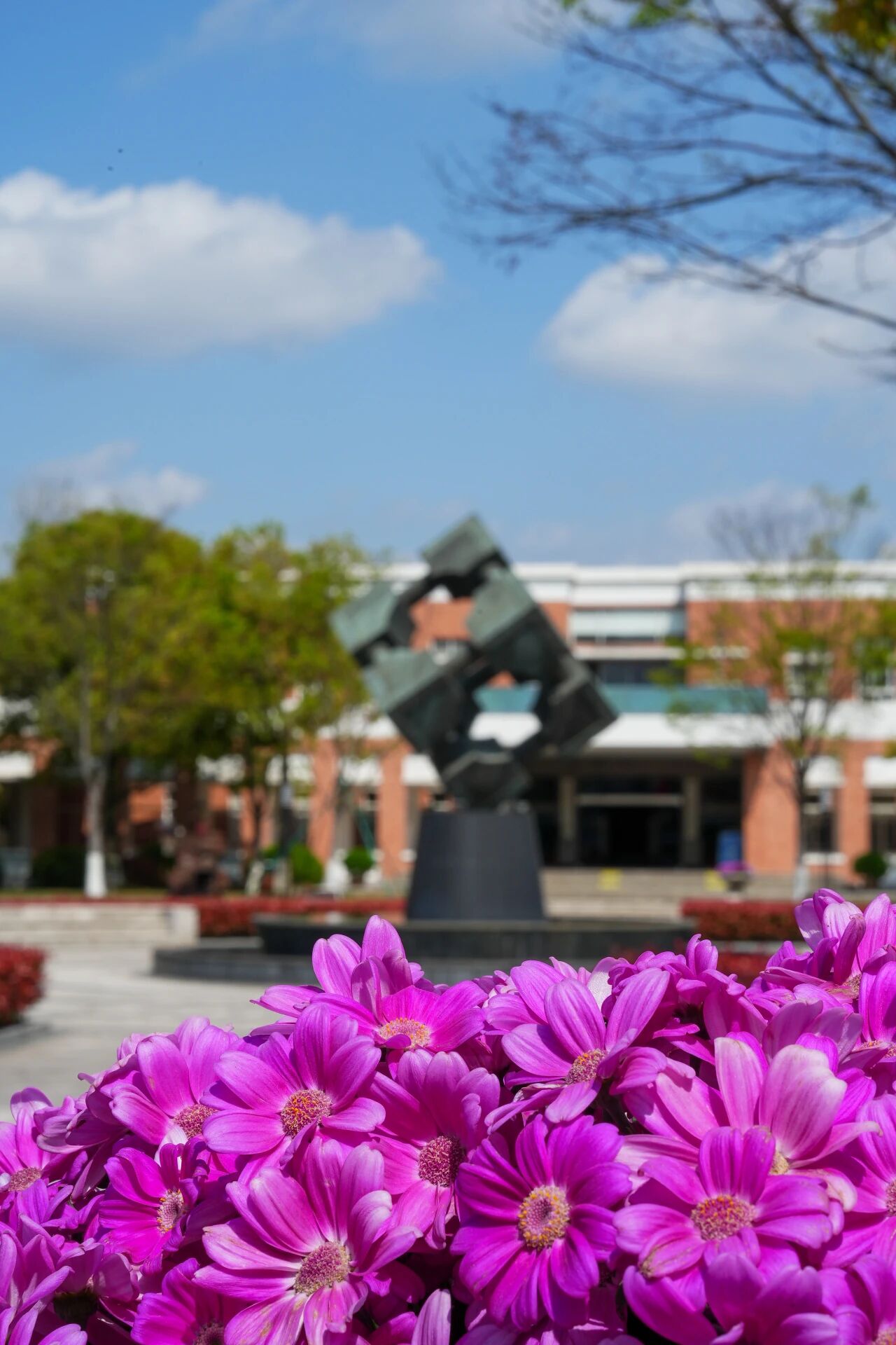 @浙江机电职业技术大学圆方塑旁,瓜叶菊开得正好。