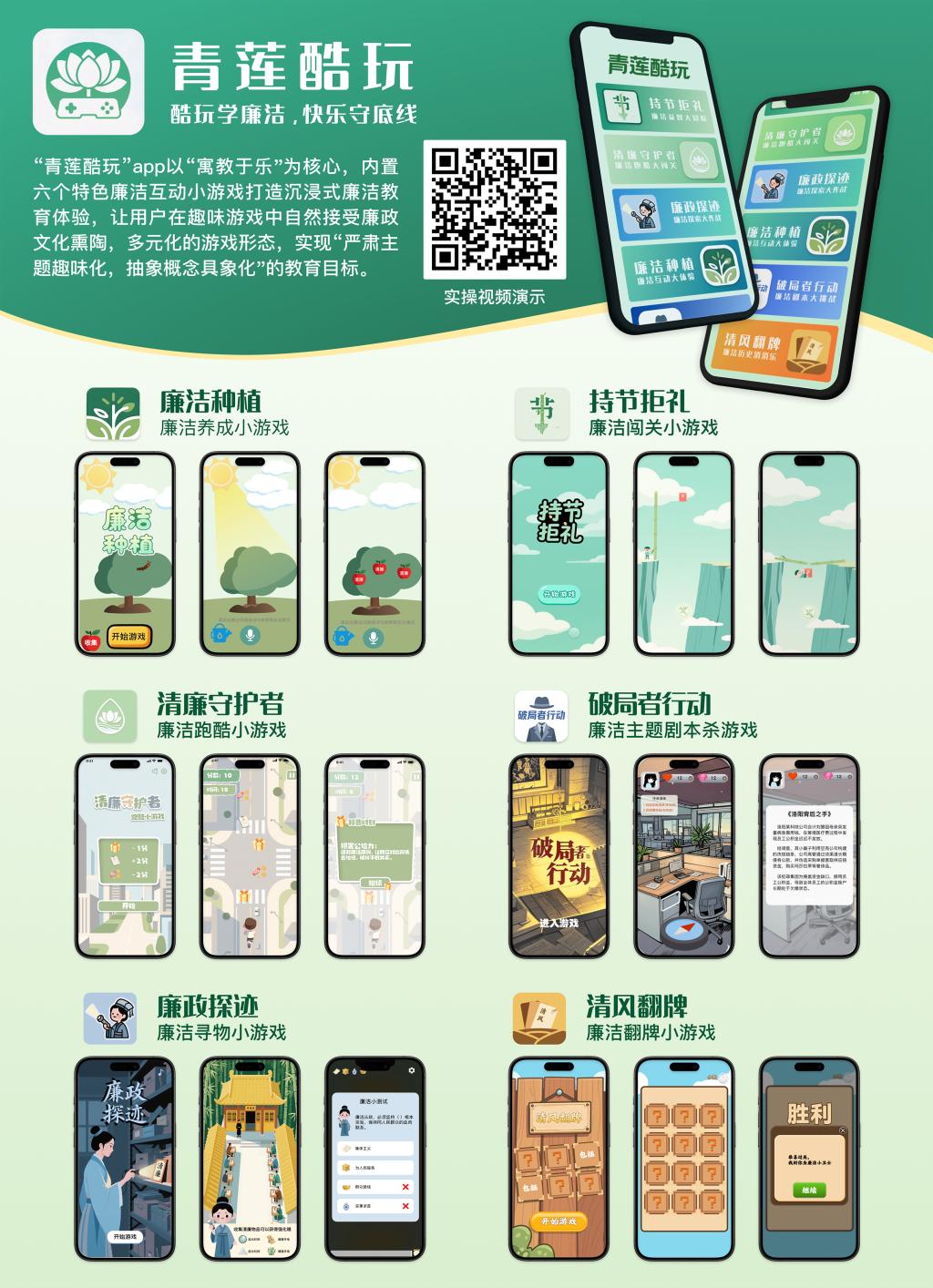 简介:《青莲酷玩》app以“寓教于乐”为核心,内置六个特色廉洁互动小游戏打造沉浸式廉洁教育体验,让用户在趣味游戏中自然接受廉政文化熏陶,多元化的游戏形态,实现“严肃主题趣味化,抽象概念具象化”的教育目标。