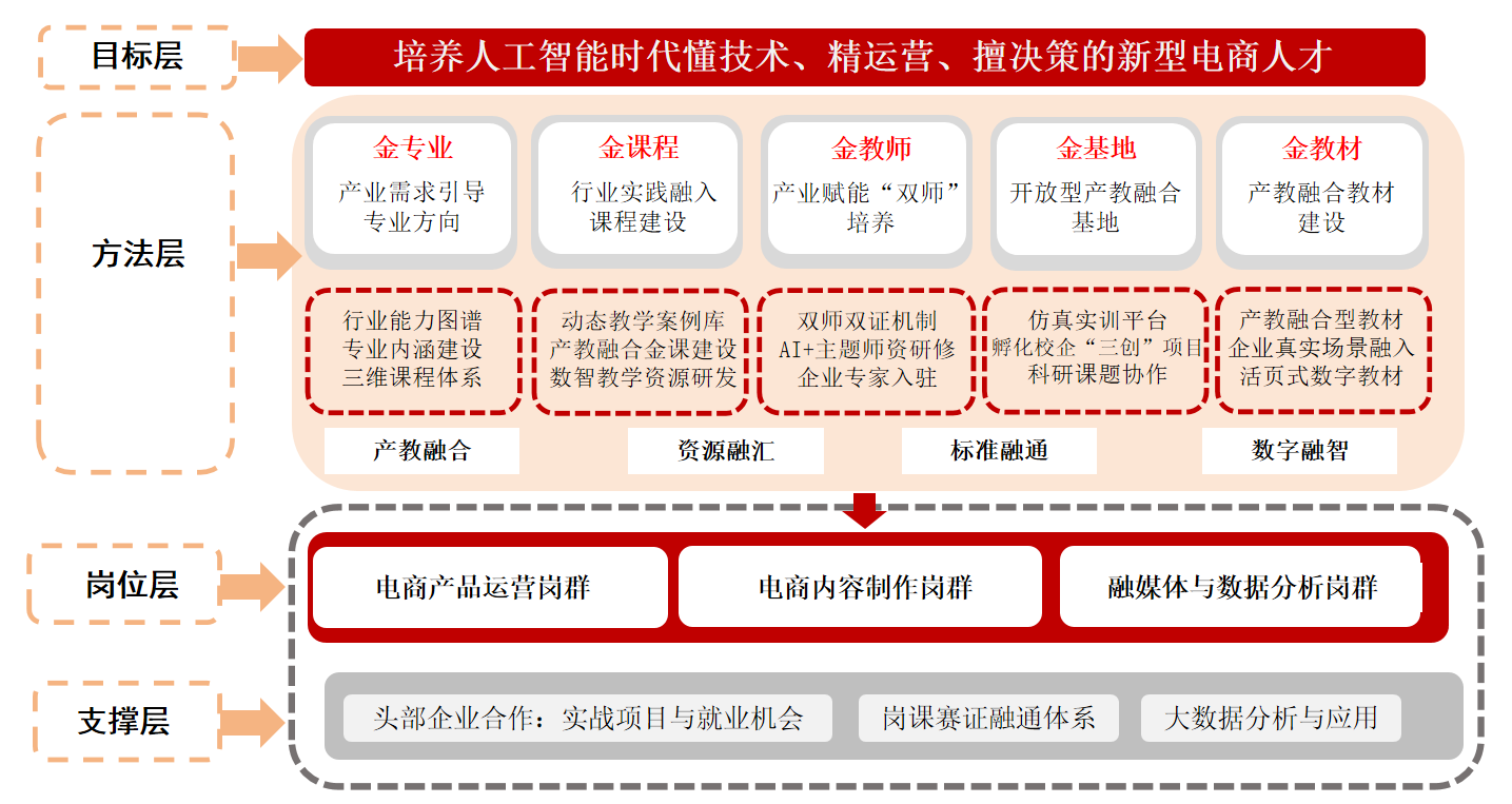 本专业面向人工智能时代电商发展需求,培养兼具人工智能商业创新与电商智能运营能力的复合型人才。学生构建扎实的电商理论及运营管理知识体系,掌握人工智能与大数据分析核心技术,能够胜任智能电商生态多元岗位。