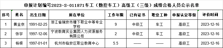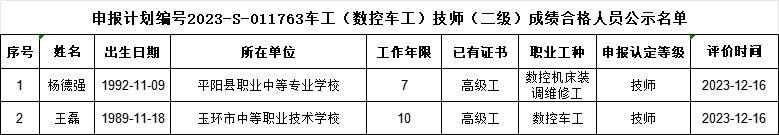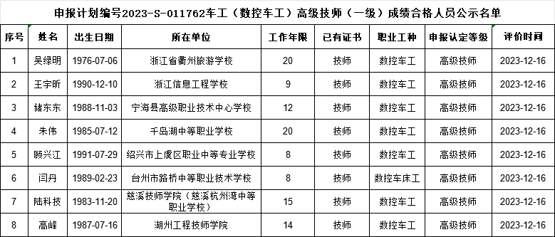现将计划号2023-S-011762车工(数控车工)(一级)、2023-S-011763车工(数控车工)技师(二级)、2023-S-011871车工(数控车工)高级工(三级)职业技能等级认定考生合格人员信息(详见附件)予以公示,公示期为5天(2023年12月21日----2023年12月27日)。公示期间, 有任何疑义可向相关部门反映,监督电话:0571-87772669。