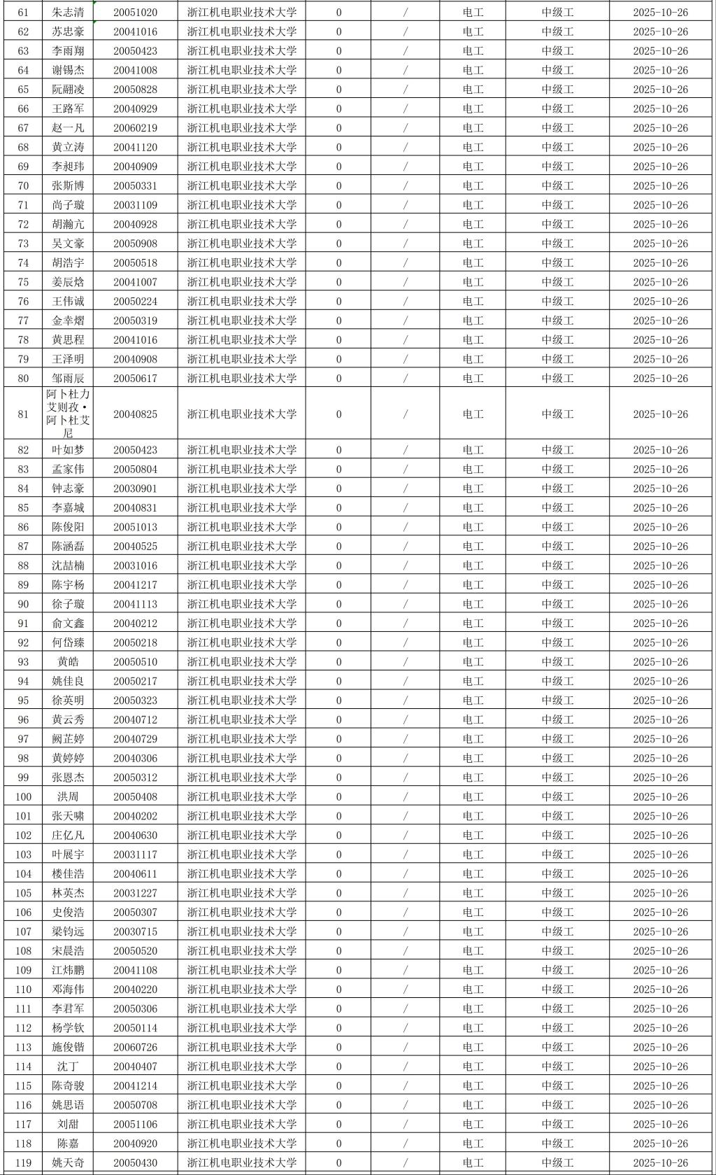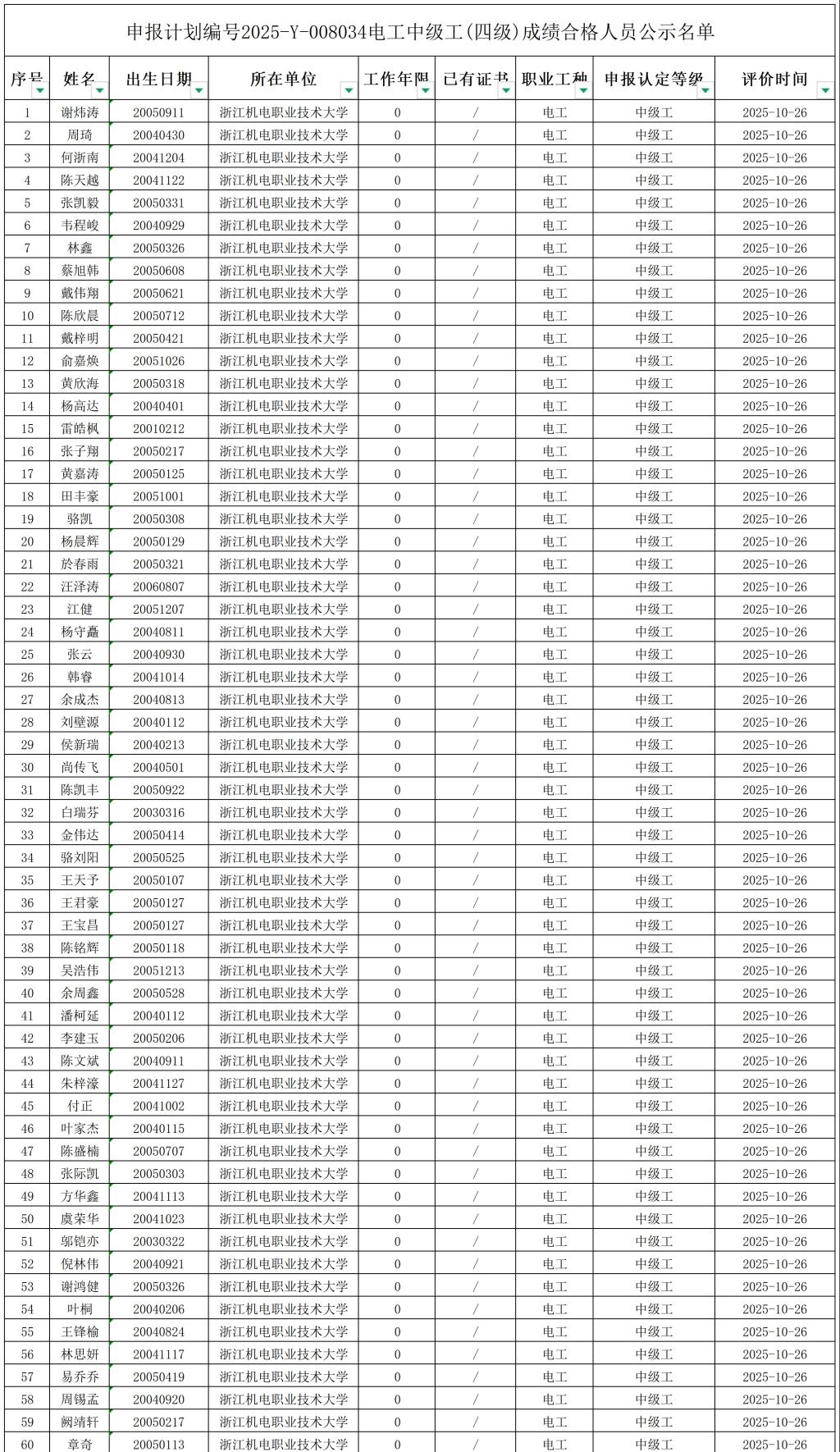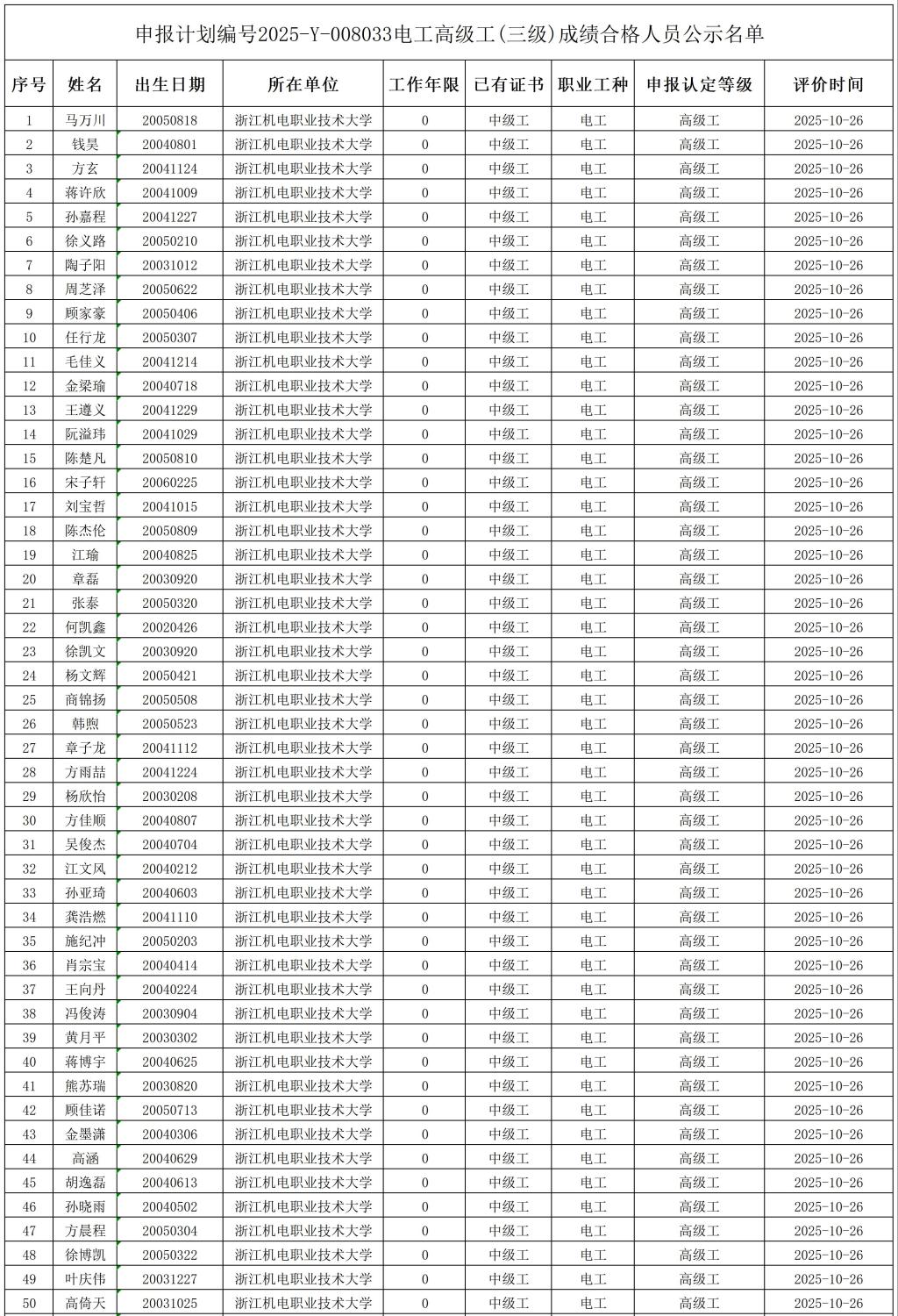 现将计划号2025-Y-008034电工中级工(四级)、2025-Y-008033电工高级工(三级)职业技能等级认定院校学生考生合格人员信息(详见附件)予以公示,公示期为(2025年10月28日----2025年11月3日)。公示期间,有任何疑义可向相关部门反映,监督电话:0571-87772669。