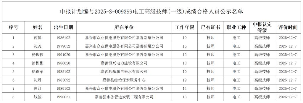 现将计划号2025-S-009399电工高级技师(一级)职业技能等级认定社会人员考生合格人员信息(详见下表)予以公示,公示期为(2025年12月9日----2024年12月15日)。公示期间,有任何疑义可向相关部门反映,监督电话:0571-87772669。