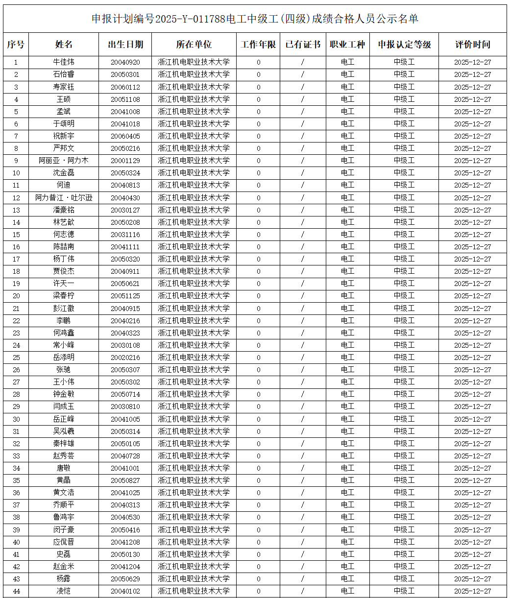 现将计划号2025-Y-011789电工工高级工(三级)、2025-Y-011788电工工中级工(四级)职业技能等级认定院校学生考生合格人员信息(详见下表)予以公示,公示期为(2025年12月30日----2026年1月5日)。公示期间,有任何疑义可向相关部门反映,监督电话:0571-87772669。