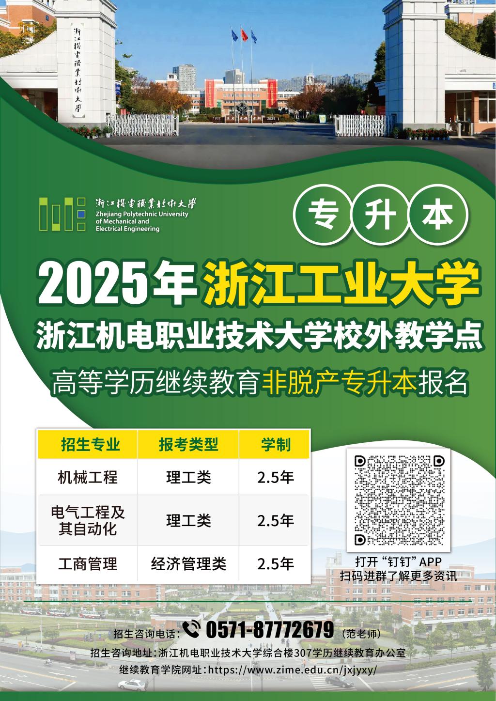 2025年,为助力广大学子踏上持续深造的光明征途,浙江机电职业技术大学再度携手浙江工业大学,共同开展高等学历继续教育非脱产专升本项目,热忱欢迎专科毕业生踊跃报考。