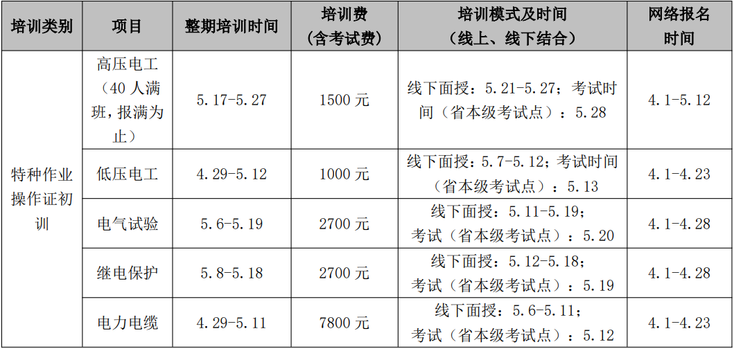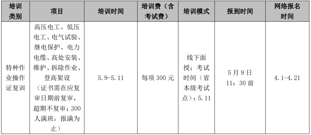 为提高电力施工企业作业人员工作能力,增强安全意识,做到持证上岗,根据《中华人民共和国安全生产法》、《浙江省安全生产条例》、《特种作业人员安全技术培训考核管理规定》(国家安全生产监督管理总局令第30号)有关规定,我校结合实际情况定于2026年5月举办特种作业操作证培训班,现将有关事项通知如下: