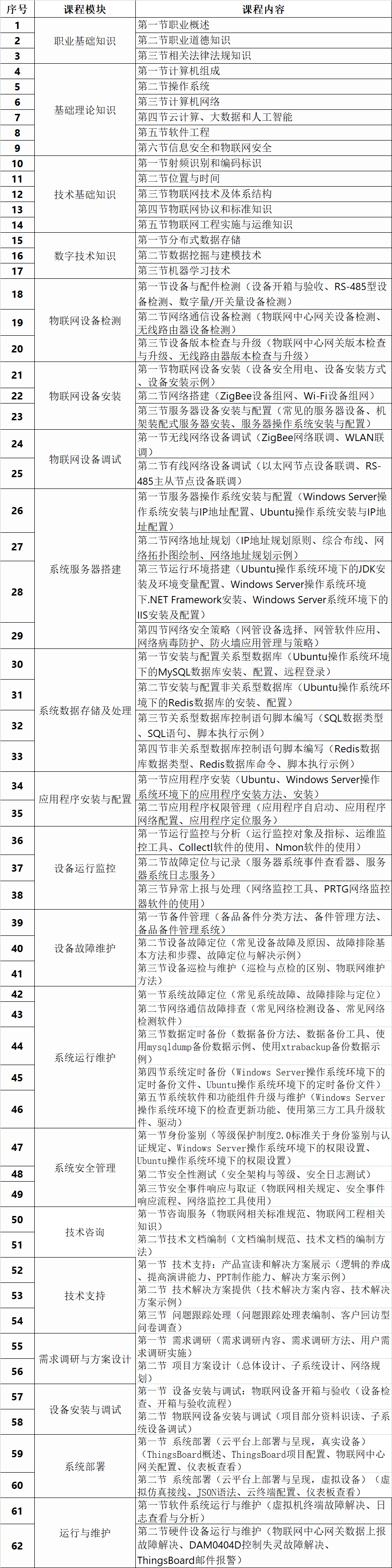 根据《物联网工程技术人员初级国家职业技术技能标准》设置培训内容,包含以下理论知识和能力实践内容,共计128学时,实际培训安排以最终课表为准。