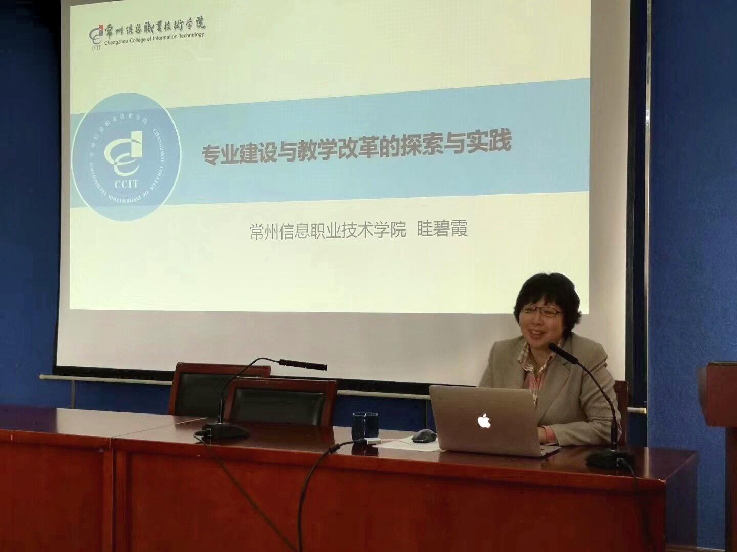 学院眭碧霞副校长出席并作题为“专业建设与教学改革的探索与实践”的主题报告。眭院长立足专业建设、教学改革两大主题,逐步、深入地介绍了该校专业重构计划、专业群建设以及课程建设、专业资源库建设、课程教学实施等方面的的思路、措施、案例,她指出:该校作为中国高职教育“常州模式”实践者与引领者,更要做好信息类院校建设与发展的“常信方案”。