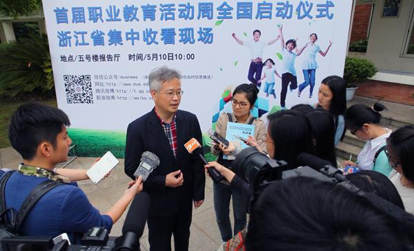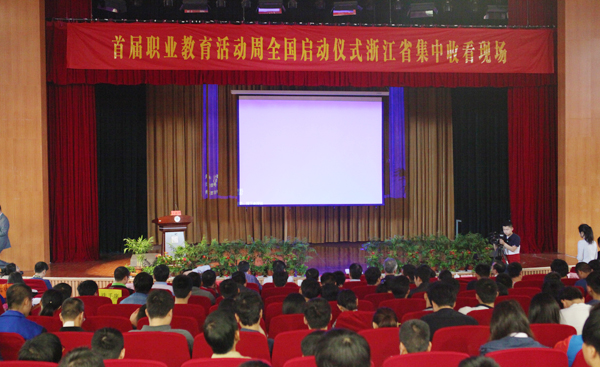 职教周启动仪式浙江省集中观看现场设在我院。省教育厅副厅长朱鑫杰、省人社厅副厅长仉贻泓、省机电集团党委副书记葛伟民、学院党委书记黄道平、省人社厅职业能力建设处处长项薇、省教育厅高等教育处处长韩剑、省教育厅职成教处处长王志泉、副处长高迎春及我校副院长王建林等领导出席本次集中观看,活动由王志泉处长主持。