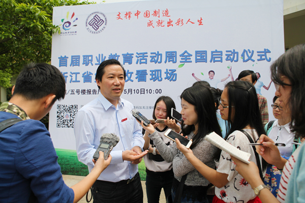 集中观看结束后,机电集团党委副书记葛伟民、学院党委书记黄道平和省教育厅职成教处处长王志泉作为企、校、政三方代表接受了媒体采访。