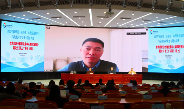 12月3日上午,培训班开班仪式如期举行。教育部职业教育发展中心教师工作处副处长涂三广、中国首位心理健康教育特级教师钟志农受邀出席,我校继续教育学院院长发表热情洋溢的欢迎辞,向远道而来的参训学员表示诚挚问候,详细介绍了学校的办学特色与心理健康教育工作基础,并预祝本次培训取得圆满成功。涂三广副处长通过线上方式致辞,强调了新时代职业院校心理健康教育工作的重要意义,对参训教师提出了“深耕专业、守护成长”的殷切期望。