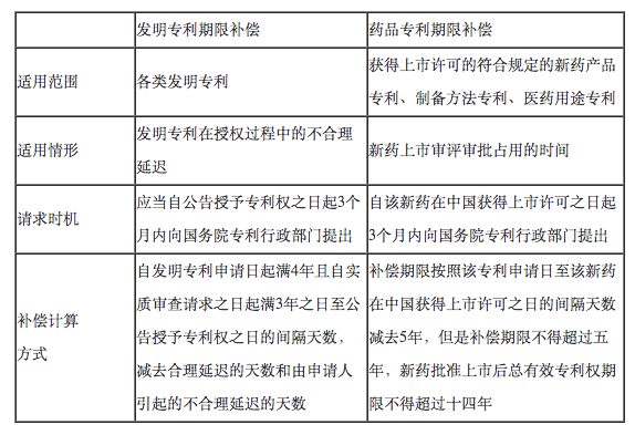 从上面的介绍可以看出,按照新实施细则的规定,上述发明专利期限补偿制度和药品专利期限补偿制度各有特点,为了便于理解,下面以表格形式将两者进行了对比。