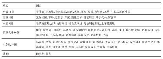 “一带一路”沿线是东连亚太地区,西连欧洲,南连非洲的一个区域,并没有准确的地理和空间范围。根据相关研究分为:东盟11国、南亚8国、中亚5国、西亚北非19国及中东欧19国等国家见表1,相关国家工业化阶段分类见表2。