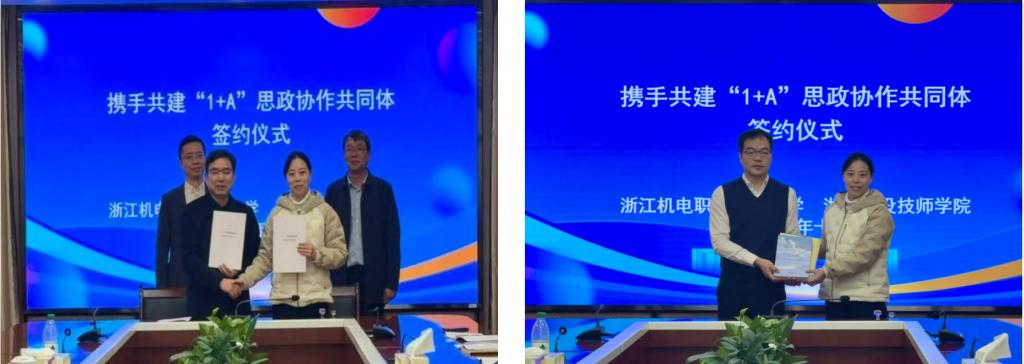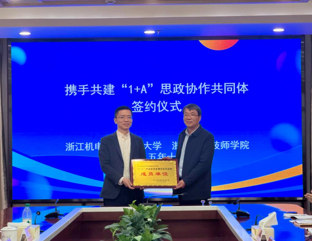 在协作共同体单元签约授牌仪式上,浙江机电职业技术大学党委副书记彭杨发表讲话。他指出,“1+A” 协作共同体要切实立足职业教育类型特点,以共同体建设为契机,打破学段壁垒,抓好育人资源整合,推动中高职思政课教学内容贯通、师资队伍共建、评价体系协同,共同打造 “真理的味道” 职业教育思政金课,培养更多德技并修的高素质技术技能人才。浙江建设技师学院党委书记徐永良表示,作为协作共同体成员单位,学校将科学定位学段思政课教学目标,积极发挥技师学院校地合作、产教融合优势,高度重视、主动融入思政课共同体建设,为推进全省中高职思政一体化发展做出技师学院的贡献。随后,彭杨副书记代表浙江机电职业技术大学为浙江建设技师学院授牌,徐永良书记代表学院接牌,标志着双方正式结成思政课建设协作共同体,将凝心聚力开创中高职思政课一体化建设新局面。浙江机电职业技术大学马克思主义学院院长查广云与浙江建设技师学院思政部主任吉庆还代表双方签订了协作共同体单元合作协议。浙江机电职业技术大学马克思主义学院党总支书记熊峰代表学院向浙江建设技师学院思政部赠送了《之江匠心》图书。