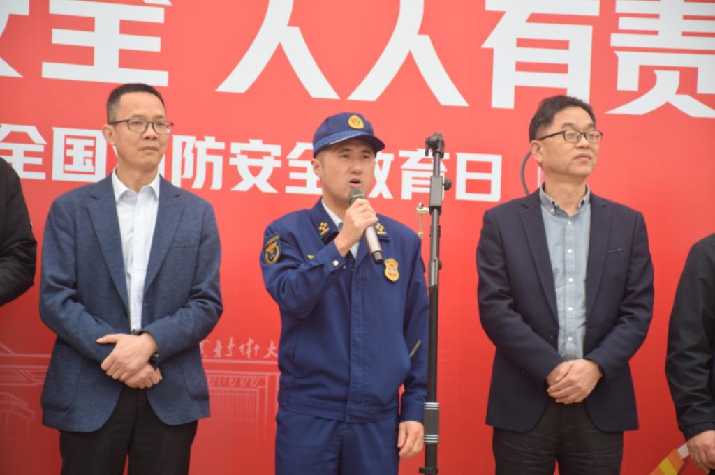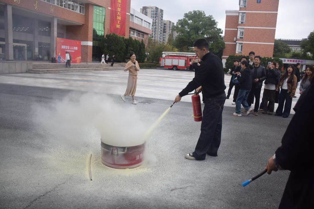 2025年11月9日是第34个全国“119”消防日,11月是消防宣传月。为深入贯彻落实习近平总书记关于安全生产的重要指示,强化校园安全防控措施,增强师生员工的安全意识,提高师生面对突发事件的自防自救能力,我校安全保卫部联合学工部、人事处、资产处、后勤处、各二级学院等相关部门,在滨江校区开展了“119”消防宣传月活动暨人员应急疏散演练活动。副书记陈剑波、滨江消防大队浦沿站指导员柴昊皞、安全保卫部副部长汪荣青、资产处处长任峰、学工部副部长杨哲、各二级分院总支书记等领导出席活动。后勤、实验实训室、安保人员以及各学院学生代表等200余人参加了本次活动。