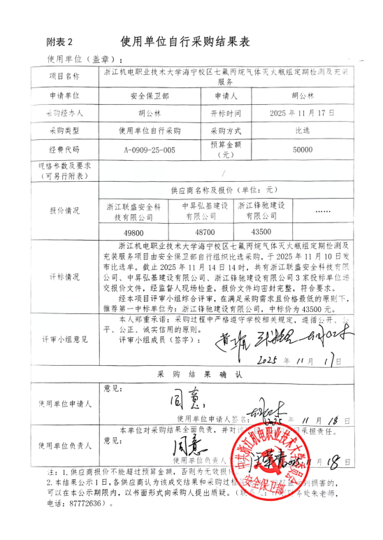 浙江机电职业技术大学海宁校区七氟丙烷气体灭火瓶组定期检测及充装服务采购比选结果公示