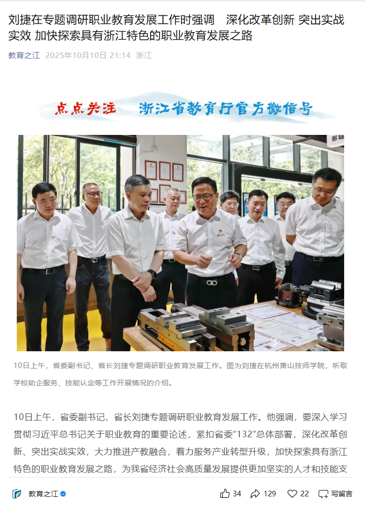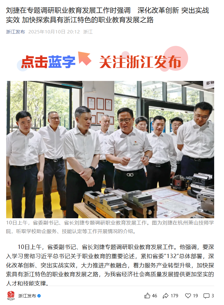 [浙江发布]刘捷在专题调研职业教育发展工作时强调...