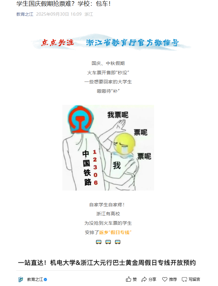 [教育之江]学生国庆假期抢票难?学校:包车!