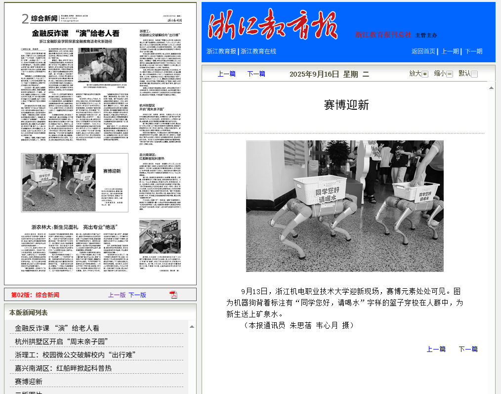 9月13日,浙江机电职业技术大学迎新现场,赛博元素处处可见。图为机器狗背着标注有“同学您好,请喝水”...