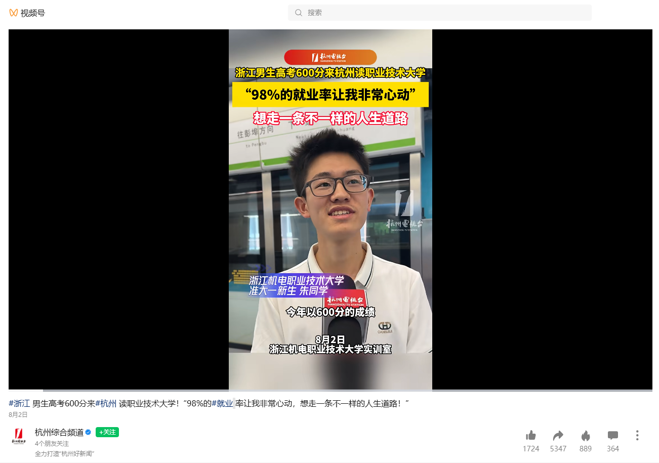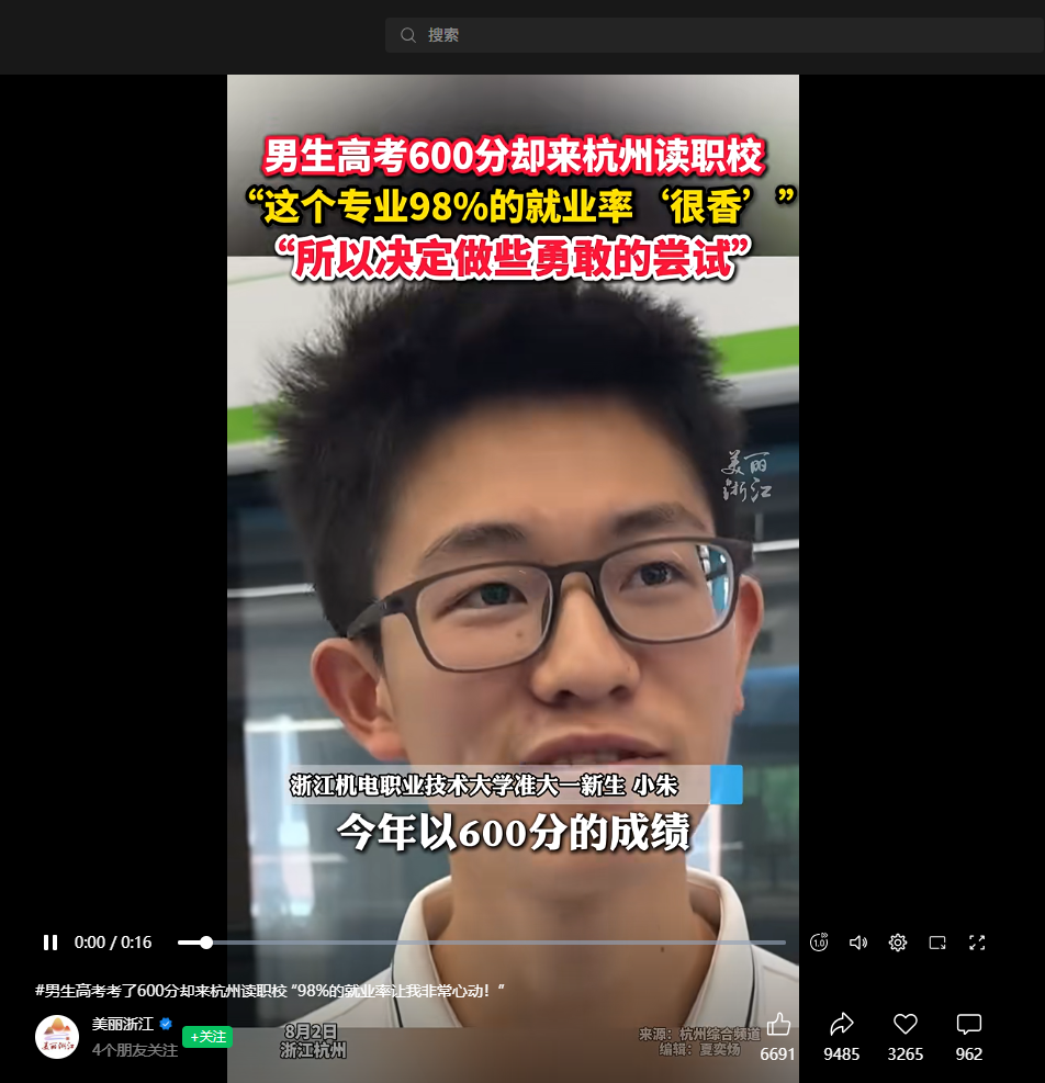 [美丽浙江视频号]#男生高考考了600分却来杭州读职...