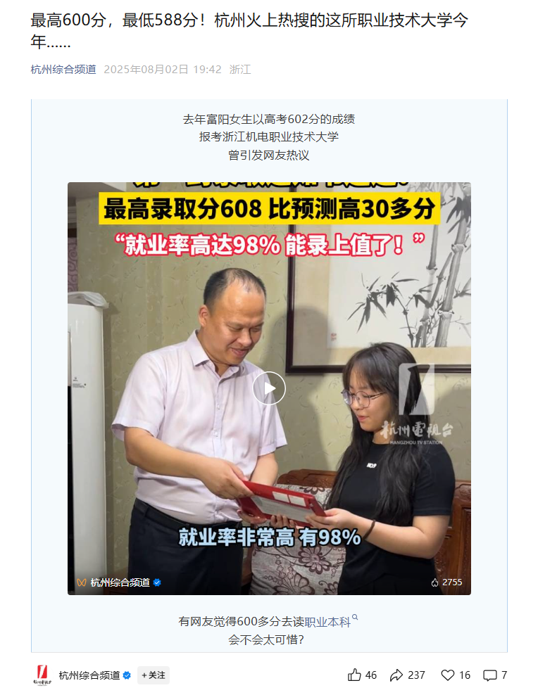 去年富阳女生以高考602分的成绩 报考浙江机电职业技术大学 曾引发网友热议 有网友觉得600多分去读职业本...