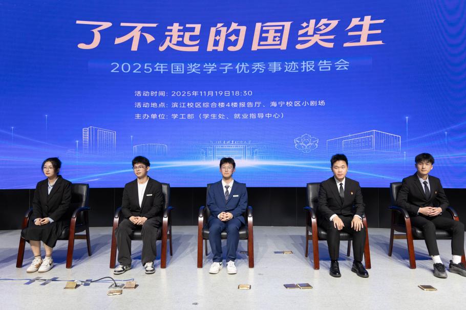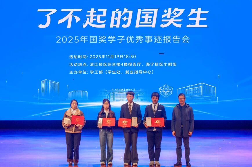 11月19日,“了不起的国奖生”2025年国奖学子优秀事迹报告会在学校滨江校区综合楼四楼报告厅和海宁校区小剧场同步举办。