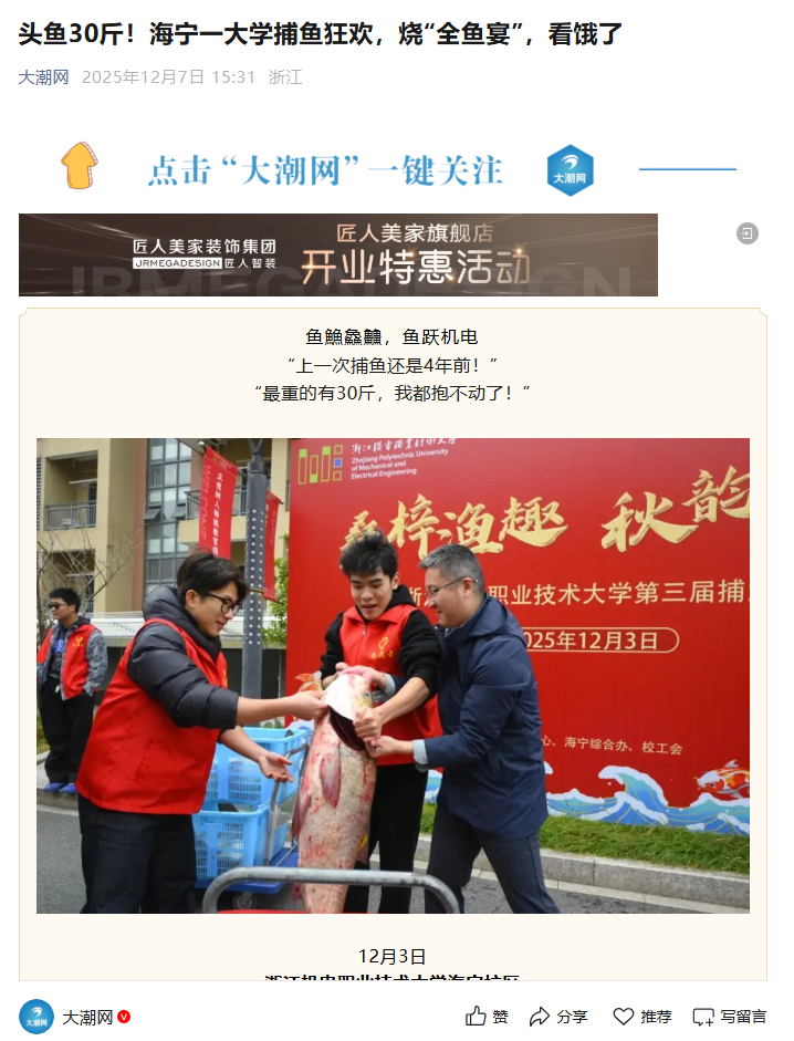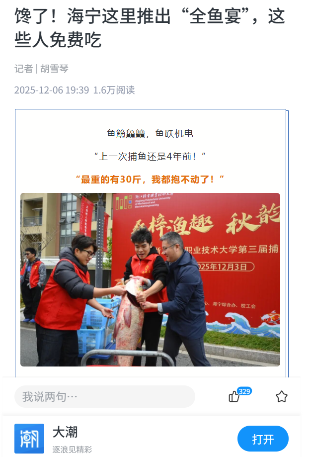 鱼䲆鱻䲜,鱼跃机电“上一次捕鱼还是4年前!”“最重的有30斤,我都抱不动了!”12月3日浙江机电职业技术大学海宁校区一场喜气洋洋的捕鱼活动拉开帷幕此次共捕捞约600斤鱼全校师生免费吃眼馋了!上午9时,校园里桑梓河畔已聚集了众多师生。“快看,网动了!”“那边有鱼跳起来了!”伴随着阵阵期待的欢呼,捕鱼活动正式开始。“一二三,收网!”捕鱼师傅一声吆喝,渔网逐渐收紧,水面开始沸腾。只见拖网在波光粼粼的水面划出弧...