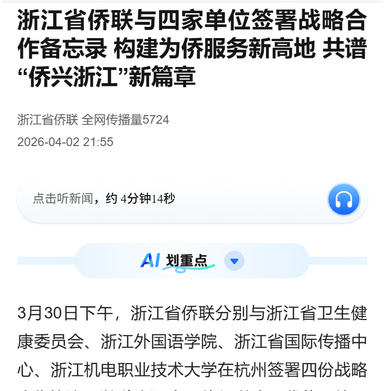 3月30日下午,浙江省侨联分别与浙江省卫生健康委员会、浙江外国语学院、浙江省国际传播中心、浙江机电职业技术大学在杭州签署四份战略合作协议,以“为侨服务、资源共享、优势互补、协同发展”为核心导向,深度整合侨务资源与各领域专业优势,共同助力浙江高质量发展和高能级开放,为讲好“侨兴浙江”故事注入新动能。省侨联与省卫生健康委聚焦“健康中国”与“入境健康消费”双向赋能,双方将共建“浙江国际健康服务平台”,...